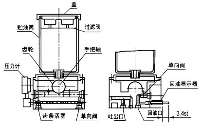 手动润滑泵是借人工摆动手把,通过齿轮带动齿条活塞往复运动实现向外供油的,当活塞处于图示极限位置时,润滑脂通过吸入口吸入并充满活塞的右腔,当活塞向右移动时,被吸入的润滑脂在油压的作用下顶开单向阀压送至出口向外排出,当系统中主分配器的一计量油口返回至回油指示器的油量达到3.2mL时,指示杆全部伸出,证明系统所有润滑点已得到所需的润滑油量,此时停止操作手把并把指示杆向内压进,为下循环准备,指示器内的润滑脂经单向阀返回贮油桶内。