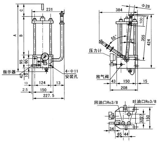 5、泵上回油指示器的作用是操作者通过观察指示器活塞指示杆的运动行程,就可知道润滑系统的供油状况。使用时,先计算好各润滑部位所需的给油量,配置分配器,并把主分配器上多设的一个出油口与手动润滑泵的回油口接通,使润滑脂返回到指示器中,如返回的油量累计达到3.28mL,则指示器的活塞指示杆全部伸出,表示各润滑点已根据需要完成一个周期的给油,应停止供油并把回油指示器的指示杆推进。