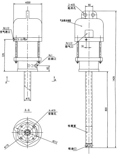 1、以托架(用户自备)作支承,用四只M16的螺栓把气动泵固定在托架上,柱塞泵管垂直插入贮油箱的油脂中。